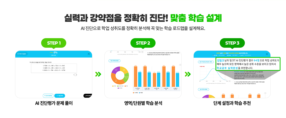 - 학습 분석 : AI 실력 분석 (누적된 학습 데이터로 단원별 성취도 분석)