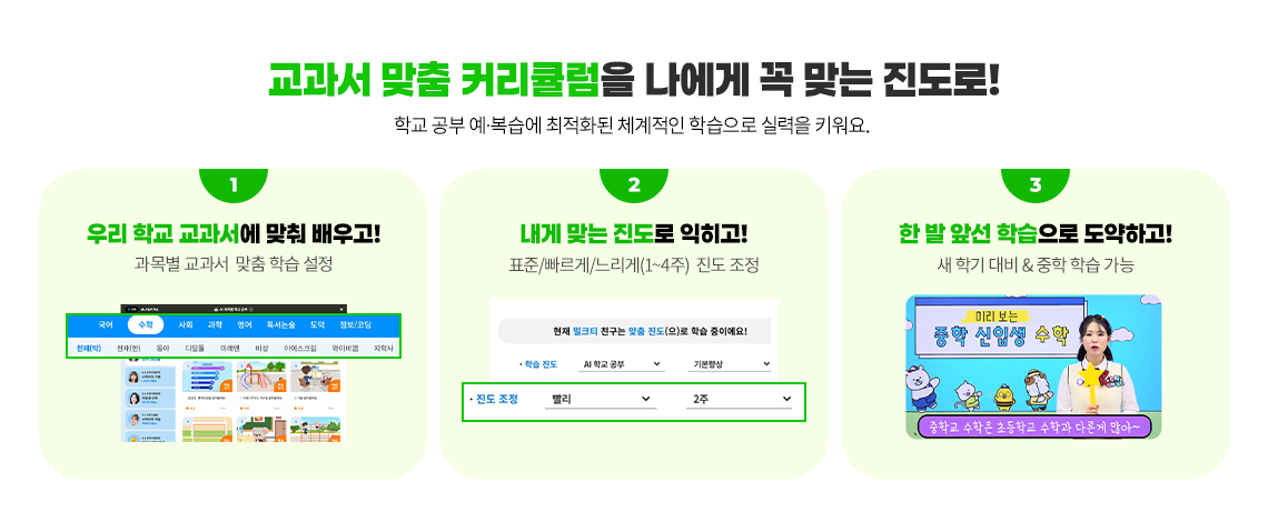 - 추천/보완 학습 : AI약점보완 학습(AI분석을 통한 약점 보완 학습 추천), 한입 쏙 학교 공부(주제별 모르는 문제와 개념 맞춤 학습)