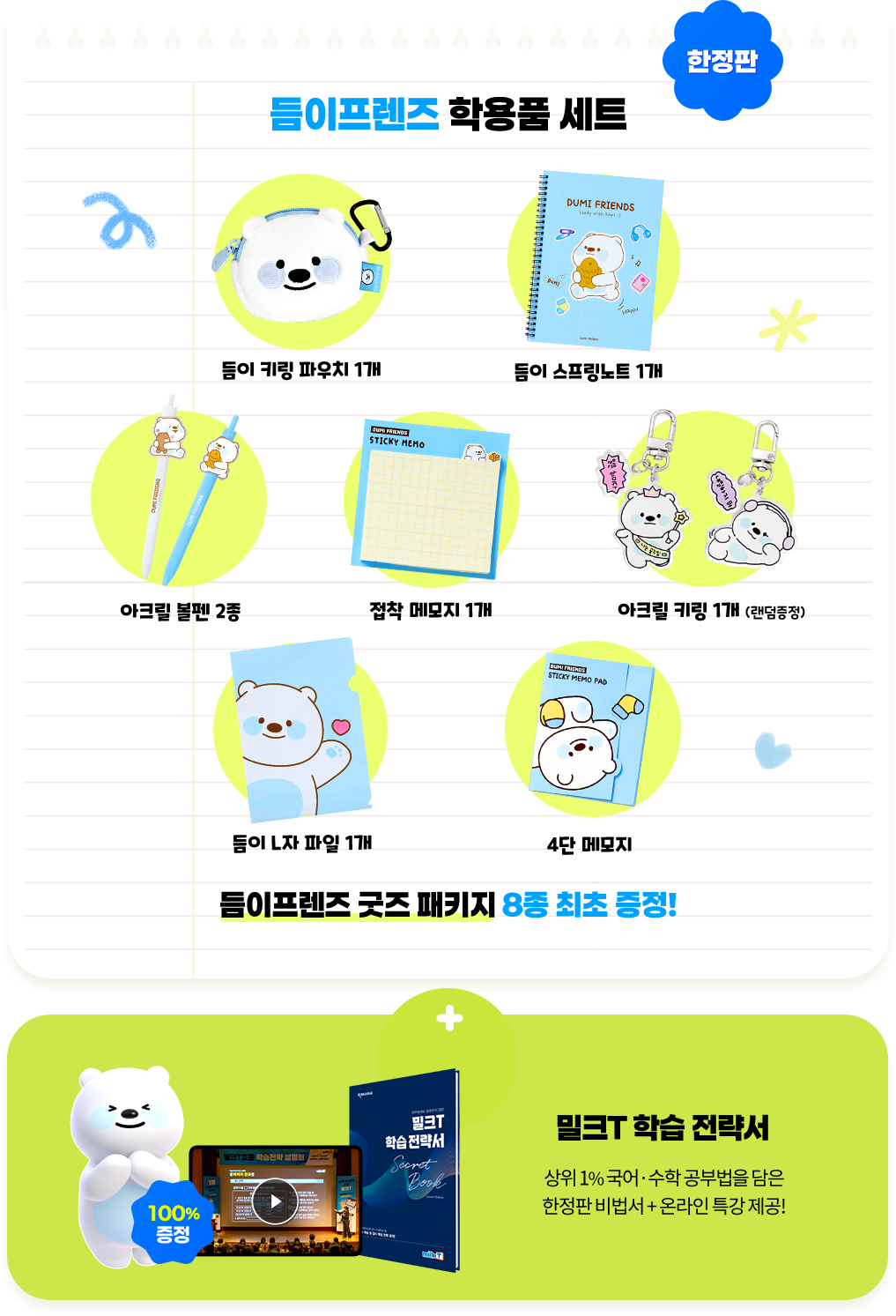 지류 학습지 정기 배송 정학습생 대상 밀크T 전용 지류 학습지 및 문제집 제공으로 '태블릿 예습 + 종이 복습'의 유기적 병행 시스템 구축